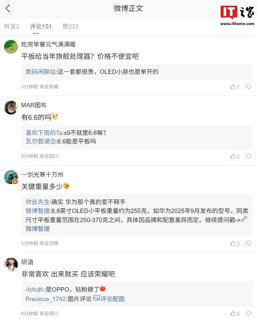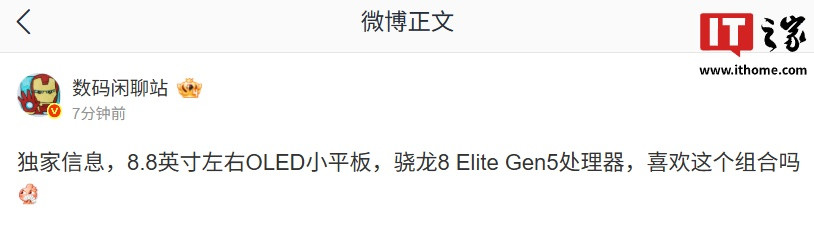 IT之家10月27日消息金领速配,博主@数码闲聊站今日发文透露,某厂将推出8.8英寸左右OLED小平板,该机搭载骁龙8EliteGen5处理器。结合评论区讨论来看,预计为OPPO新品平板。