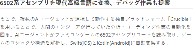 ·位于名古屋的ABC株式会社近期展示了研发成果,运用开发的AI工具,可以把红白机当初使用的6502系语言游戏数据自动换成iOS・Android应用万联证券,而且已经测试成功。